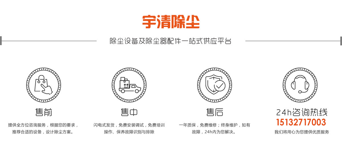 宇清除尘设备有限公司拥有多年布袋除尘器及配件的生产经验,公司拥有好的生产设备,标准化的生产工厂, 以“实体生产,货源充足,售后无忧”的经营理念服务广大客户。